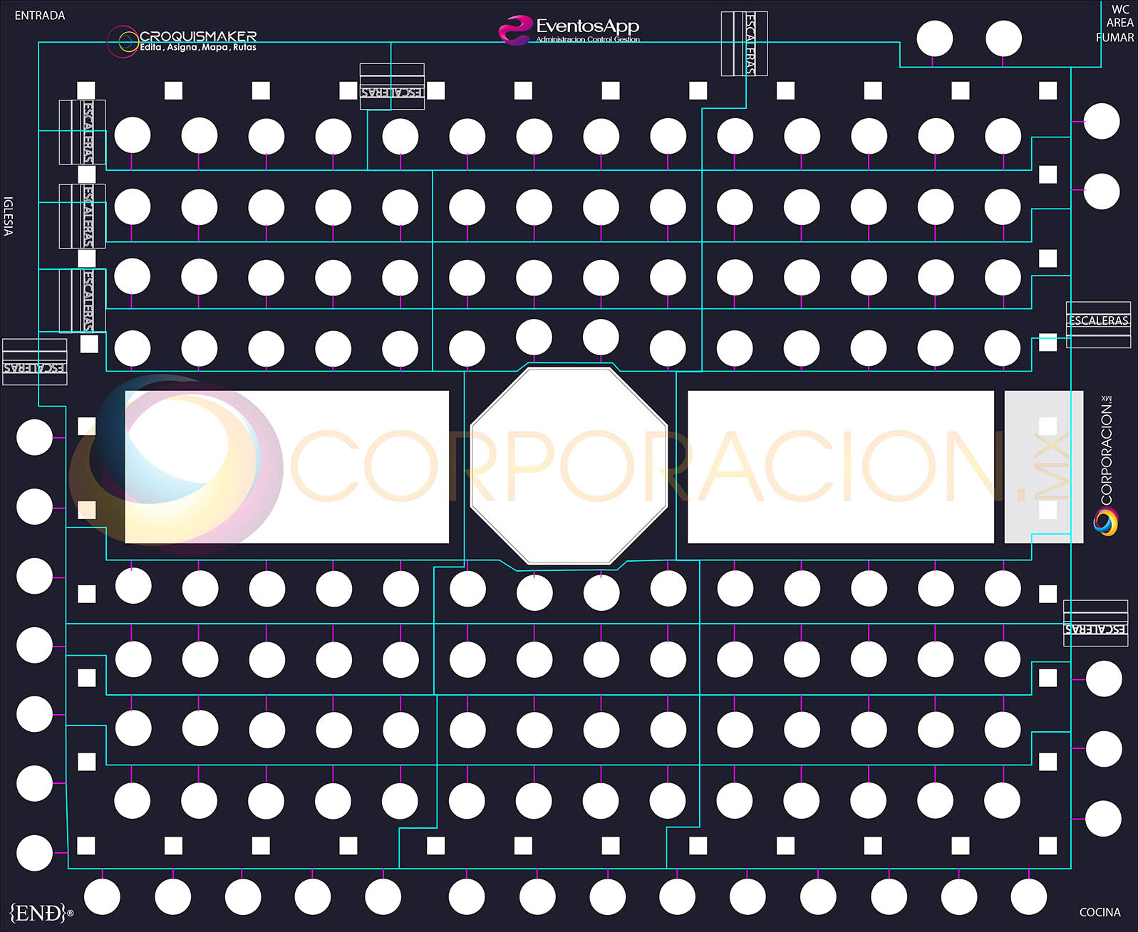 Croquis Maker es un modulo de EventosApp, que integra una interface intituitiva, sensilla de aprdender y usar, para que puedas asignasr invitados a tus mesas, edita la posision de cada montaje como si estuvieras en PowerPoint (Microsoft), Asigna Montajes acada mesa, Edita la configuracion de visualizacion de nuestra interface para personalizar cualquier croquis